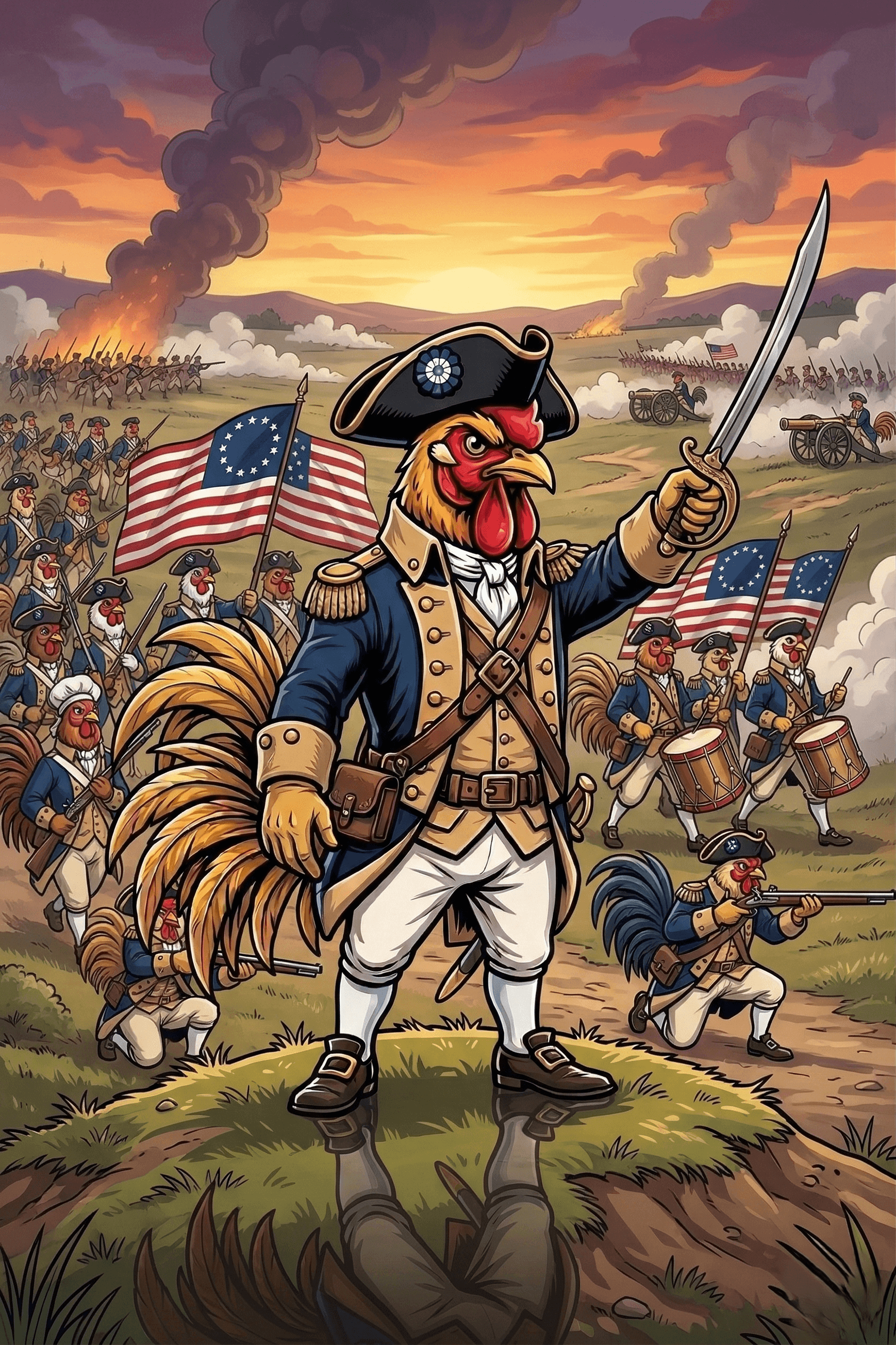 Part revolutionary, part guardian — the Rooster stands watch over democracy's fragile balance. Armed with truth and an unwavering commitment to liberty, he crows at dawn to wake a nation.